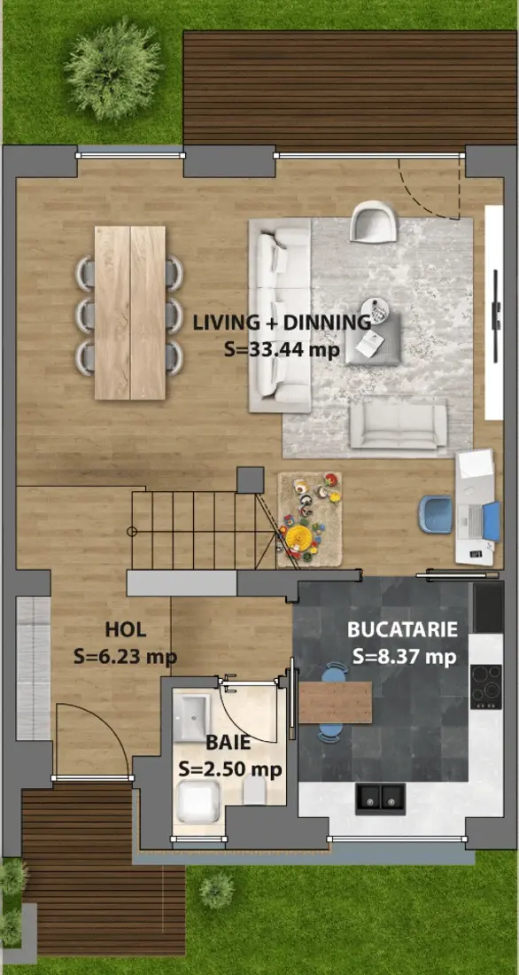 Living + dining - 33.44 mp Bucătărie - 8.37 mp Baie - 2.50 mp Hol - 6.23 mp Suprafață totală utilă - 50.54 mp Suprafață totală construită - 61.02 mp