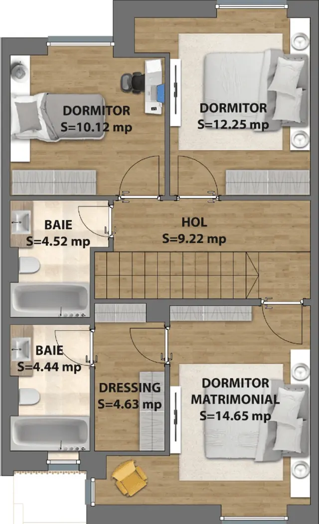 Dormitor mic - 10.12 mp Dormitor mediu - 12.25 mp Dormitor master - 14.65 mp Dressing - 4.63 mp Baie master - 4.44 mp Baie comună - 4.52 mp Hol - 9.22 Suprafață totală utilă - 59.83 mp Suprafață totală construită - 71.88 mp